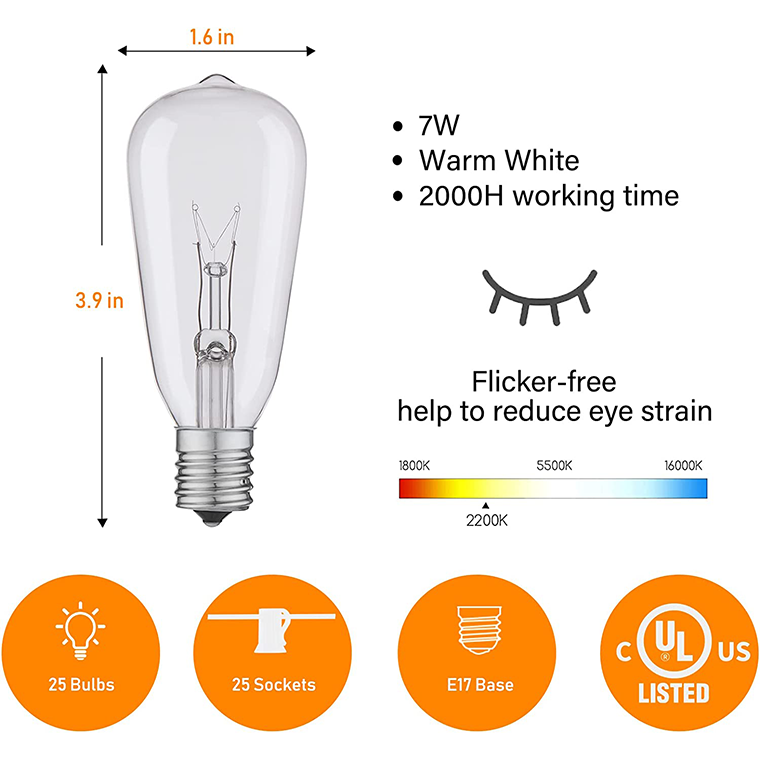 These outdoor bistro-style lights are weatherproof and UL listed. Each strand is 25 feet long with 25 incandescent bulbs connected to hanging sockets. And you can link up to 2 strands end to end to decorate a larger area.These 25×7 watts Edison bulbs are compatible with a dimmer switch ( Not Included ) to achieve greater mood lighting flexibility and soft glow. You can use a separate dimmer to further customize the light output for a birthday party, family reunion, or wedding reception.These commercial-grade patio hanging lights are mounted on a heavy-duty wire and give off a soft white glow—perfect for creating your own little outdoor paradise. Double insulation enables the bulbs to withstand elements. Flexible heavy-duty cord works well for indoor and outdoor use.
